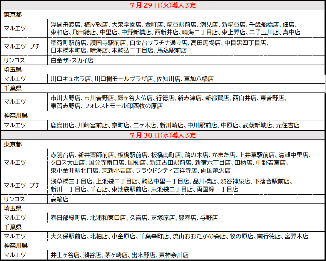 さらに、7月16日(水)に本所四丁目店(東京都墨田区)で導入した後、7月24日(木)から7月30日(水)の間に順次、マルエツ・マルエツ プチ・リンコスの全店舗(魚悦糀谷店除く)で導入いたします。