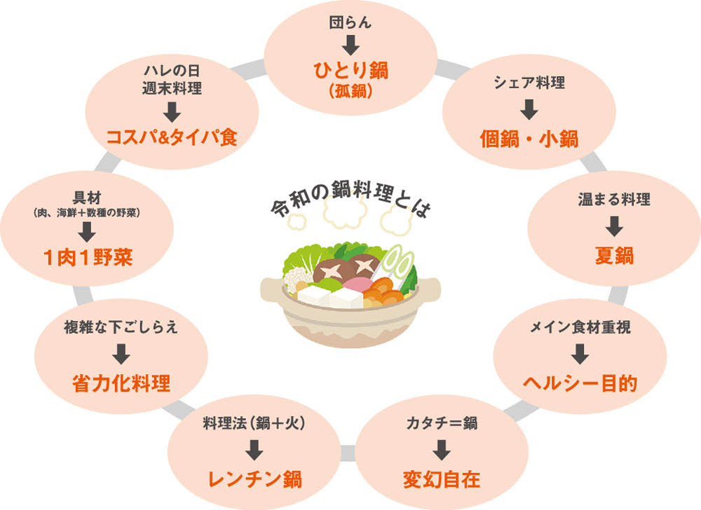 従来からの「寄せ鍋」「水炊き」といった定番の鍋から、電子レンジで温める「レンチン鍋」や具材が少ない「一肉一野菜鍋」など、調理の省力化や食材の最適化が進む一方で、「夏鍋」や「ヘルシー目的の鍋」など、季節や気分に合わせた自由な楽しみ方も広がっています。