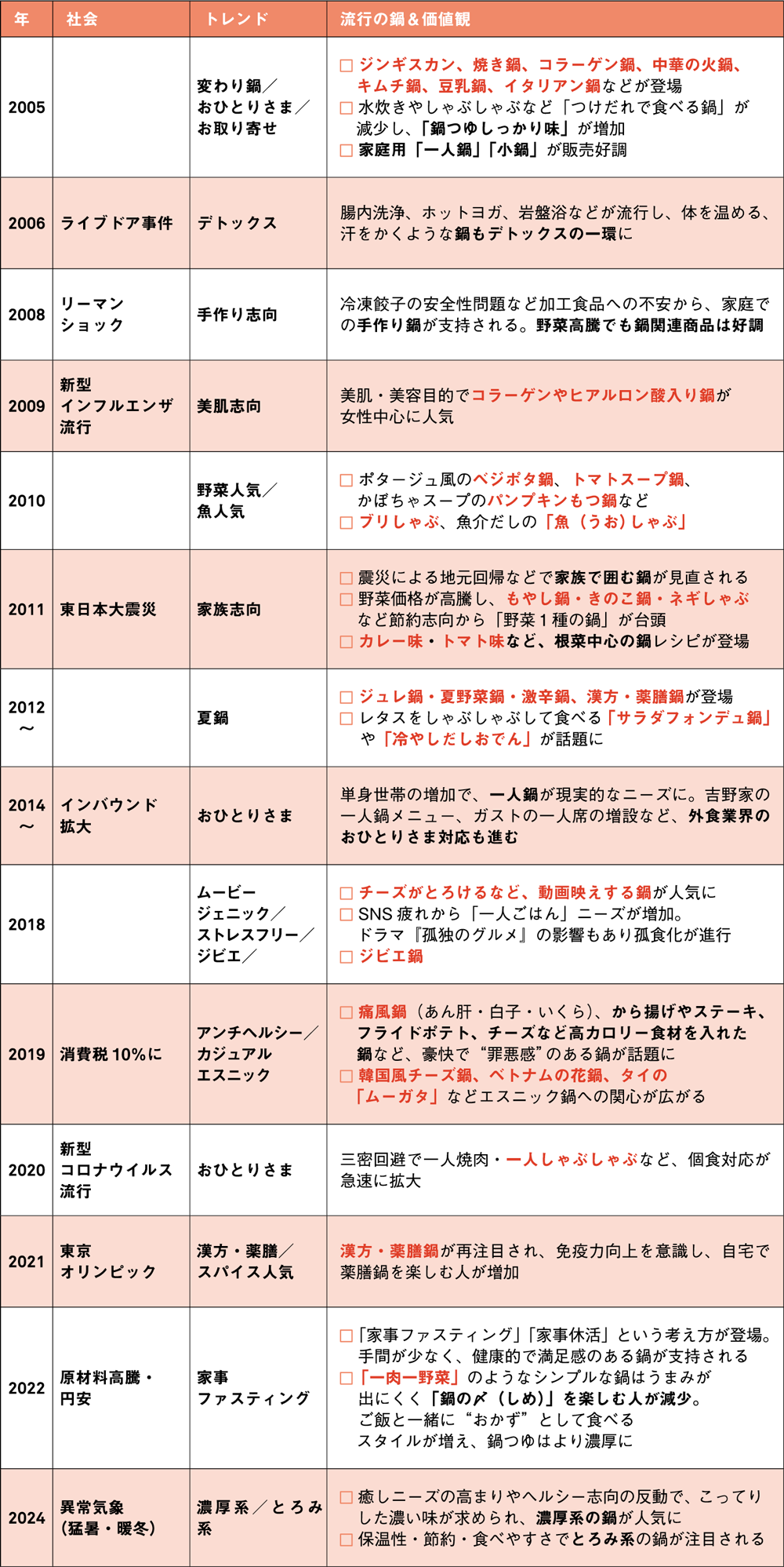 鍋のトレンドをこの20年で振り返ると、いつも社会の空気を映してきたことがわかります。2000年代前半はキムチ鍋や豆乳鍋など多様化が進み、2008年には、輸入食品の安全性に対する不安が高まり「やっぱり手作りが安心」と手作り回帰の動きが広がりました。