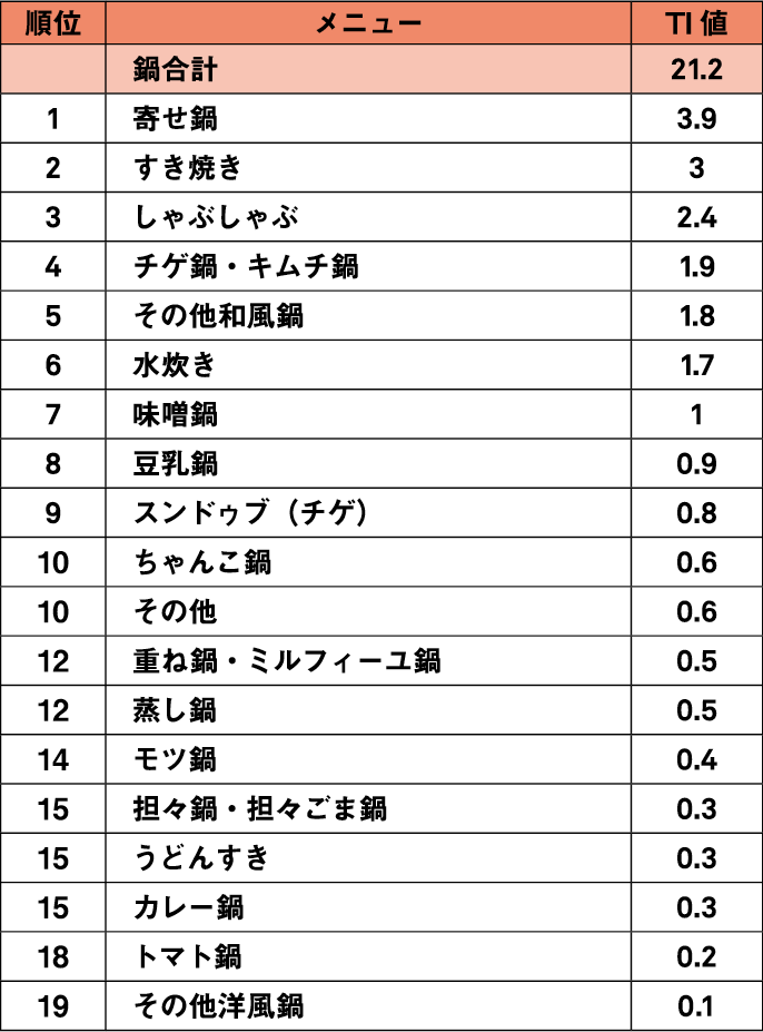 分析には「TI値」(Table Index:1,000食卓あたりの登場回数)という指標を使用して、鍋料理のメニューに注目しました。直近1年間の鍋全体のTI値は21.2で、最も多く作られているのは「寄せ鍋」(TI値3.9)、次いで「すき焼き」(TI値3.0)と、定番メニューが今も食卓に多く登場していることがわかりました。
