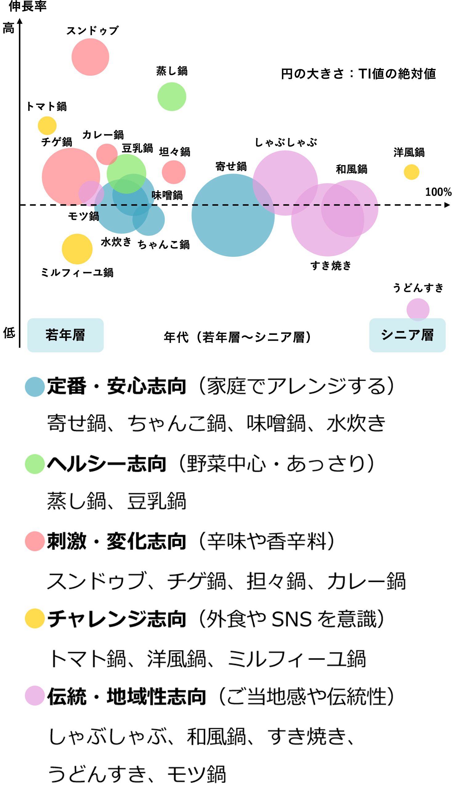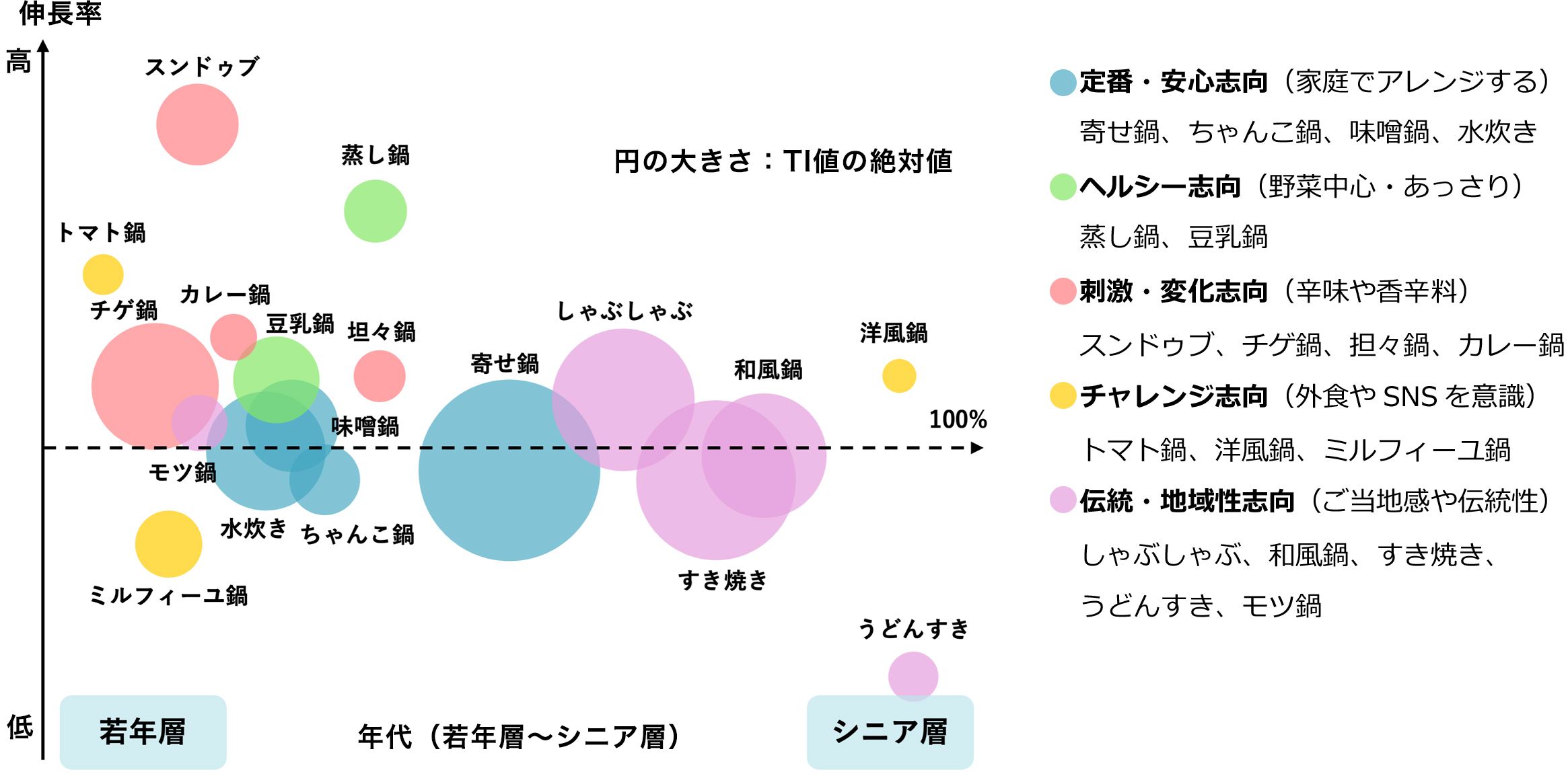 下は、鍋メニューについて、昨年からのTI値の伸び率と年代別の特徴を可視化した図です。ポジションが上にあるほど伸長率が高く、右にいくほどシニア層に、左にいくほど若年層に支持されていることがわかります。