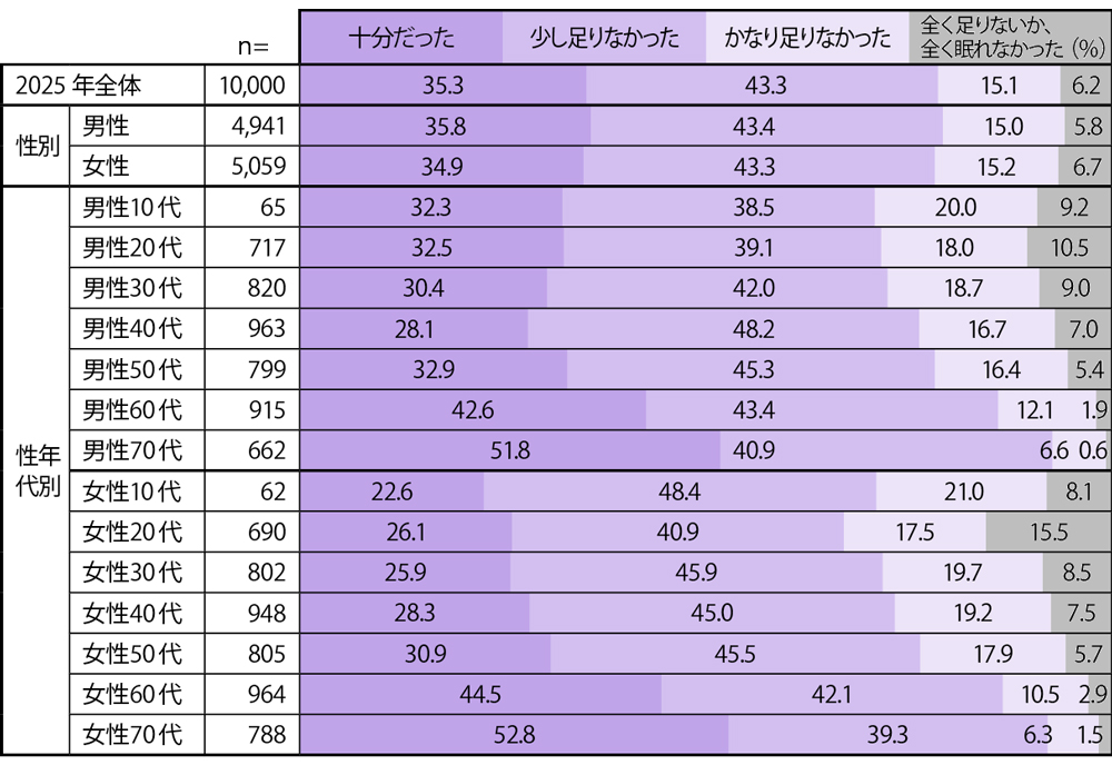 さらに、10代男女の睡眠満足度は前年より10ポイント減少しており、学生など若年層で悪化が顕著になっています。