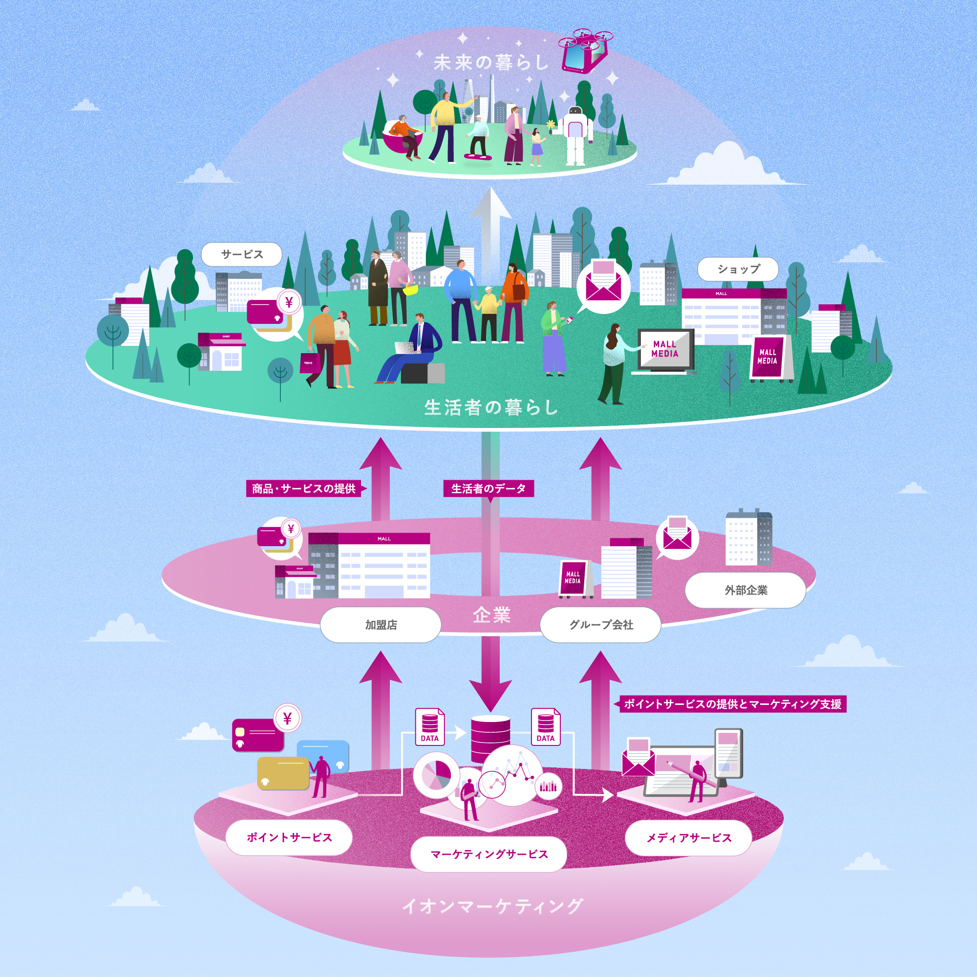 1つ目は、共通ポイント「WAON POINT」の運営や加盟店の開拓・支援を行うポイントサービス。
